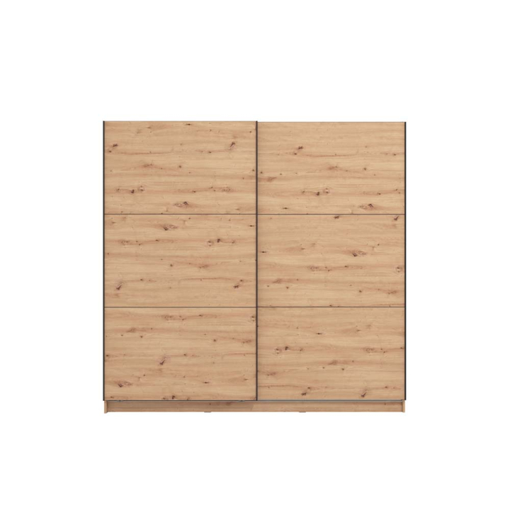 Модерен и функционален гардероб с плъзгащи се врати с размери Ш:217/Д:62,5/В:210 см. Притежава две еднотипни отделения, като във всяко е монтиран по един лост за закачалки и три рафта. Този гардероб е идеално решение за обзавеждане на помещение, където пространството е ограничено, а външният вид е от значение. Много практичното решение за него и нея. Всичките дрехи, независимо от техния стил и предназначение ще намерят своето място в гардероба. За повече удобство е препоръчително да поставите механизъм за плавно затваряне на вратите, както и паспарту с вградено осветление, което е особено атрактивно вечер.
