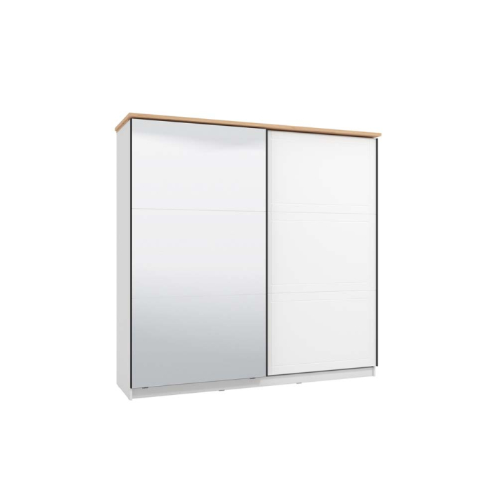 Гардероб с плъзгащи врати с размери Ш:220/Д:63.5/В:214 см. Притежава атрактивна визия с акцент към модерната и домашната естетика обособена от малките детайли, стилно допълващи дизайна на гардероба. Дясната врата е с декоративни улеи обособяващи три еднотипни правоъгълници, без които гардеробът няма да бъде същия, а горният плот е в светъл дървесен декор добавящ топлина към белия матов цвят. Лявата врата е с монтирано практично огледало, в което винаги може да ревизирате външния си вид. Моделът разполага с две отделения достъпни посредством плъзгащи врати, зад които са монтирани по един лост за дрехи и по четири рафта. Със своите две еднотипни отделения гардеробът е удачно решение за обзавеждане на спалня споделена от двойка партньори, като дрехите с различно предназначение и стил ще са добре подредени и съхранение.