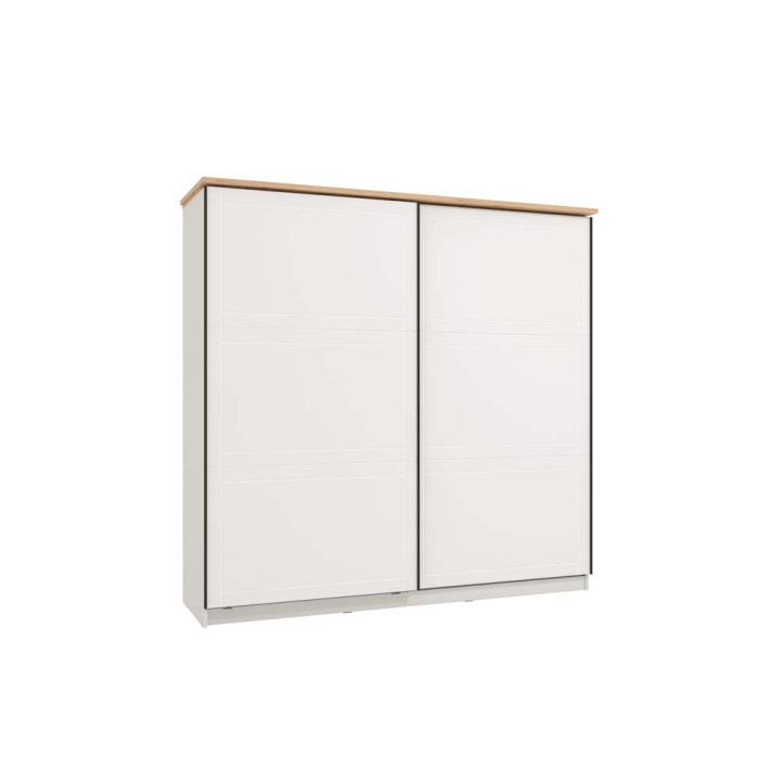 Гардероб с плъзгащи врати с размери Ш:220/Д:63.5/В:214 см. Притежава атрактивна визия с акцент към модерната и домашната естетика обособена от малките детайли, стилно допълващи дизайна на гардероба. Вратите на гардероба са с декоративни улеи обособяващи еднотипни правоъгълници, без които гардеробa няма да бъде същия, а горният плот е в светъл дървесен декор добавящ топлина към белия матов цвят. Моделът разполага с две отделения достъпни посредством плъзгащи врати, зад които са монтирани по един лост за дрехи и по четири рафта. Със своите две еднотипни отделения гардеробът е удачно решение за обзавеждане на спалня споделена от двойка партньори, като дрехите с различно предназначение и стил ще са добре подредени и съхранение.