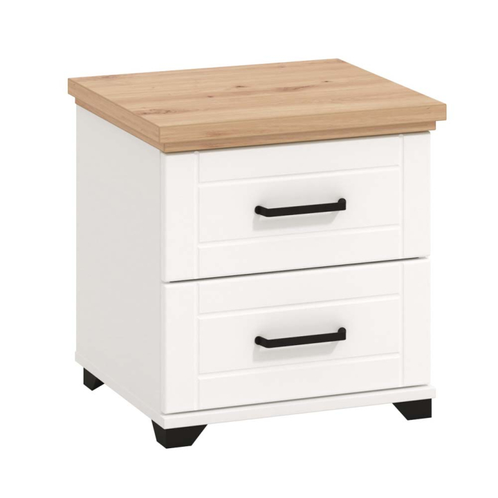 Нощно шкафче с чекмеджета с размери Ш:46/Д:41/В:47.5 см. Притежава атрактивна визия с акцент към модерната и домашната естетика обособена от малките детайли, стилно допълващи дизайна на комода. Чекмеджетата са с декоративни улеи обособяващи еднотипни правоъгълници, без които моделът няма да бъде същия, а плотът в светъл дървесен декор е добавящ топлина към белия матов цвят. Шкафчето разполага с две чекмеджета за съхранението на дреболийки в спалнята, както и компактен плот за поставянето на нощната лампа и чашата с вода. За да създадете перфектната атмосфера на романтика и домашен уют в спалнята, може да комбинирате модела с другите мебели от серия Валенсия.