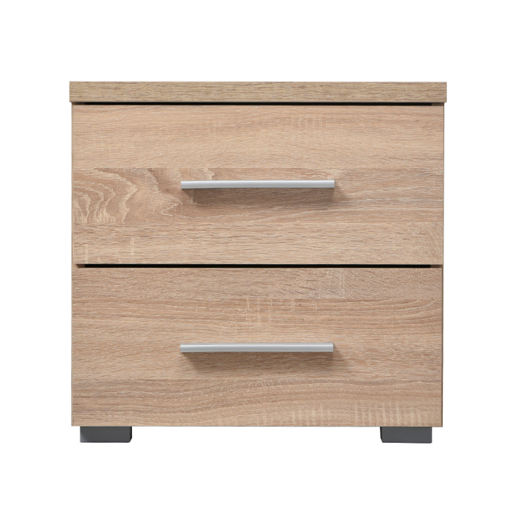 Нощно шкафче с чекмеджета с размери Ш:44.5/Д:33.5/В:43 см. Задължително допълнение към спалнята. Удобно местенце да поставите телефона или чашата с вода, само на ръка разстояние от леглото. Притежава здрава конструкция с компактен плот, 2 чекмеджета със сребристи дръжки. Моделът е с покритие устойчиво на влага и механично износване.