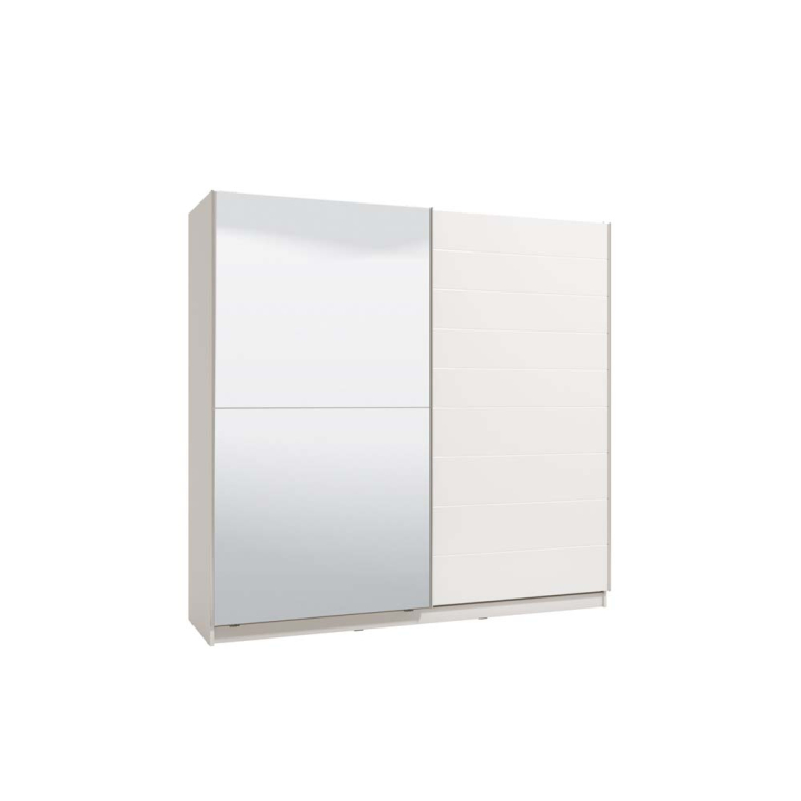 Модерен и изключително функционален гардероб, с 2 плъзгащи врати, изработен от ПДЧ и МДФ с меламиново покритие 16мм, в комбинация от декори Бял гланц, Бял мат и огледало.