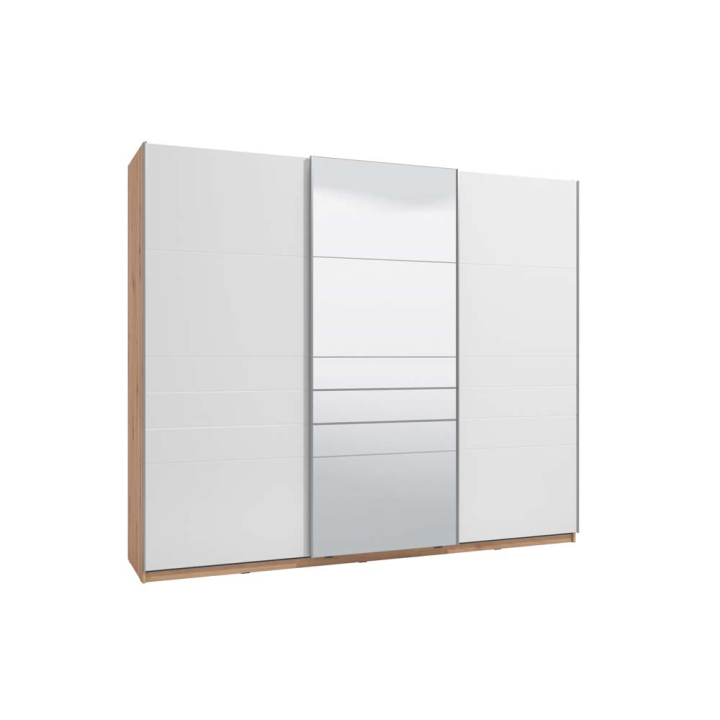 Трикрилен гардероб с плъзгащи врати, една от които огледална с размери на модела 262.5/65.5/224 см. Отличен избор за обзавеждане на спалнята, като със своята визия цялостно ще преобрази атмосферата в помещението. Вратите са произведени от MDF с луксозно гланцово покритие, а корпусът от ПДЧ с висококачествен меламин, устойчив на механично нараняване и износване. Пълноценно продуктa може да се използва от двойка споделяща общо помещение, ценящи личното пространство на партньора. Артикулът се състои от три отделения, като в крайните две са монтирани по един лост за закачалки и по един рафт, а в средното отделение четири рафта, равномерно поставени по височината на гардероба. Гардеробът с плъзгащи врати, не само изглежда страхотно, но и реално ще пести пространство в помещението.