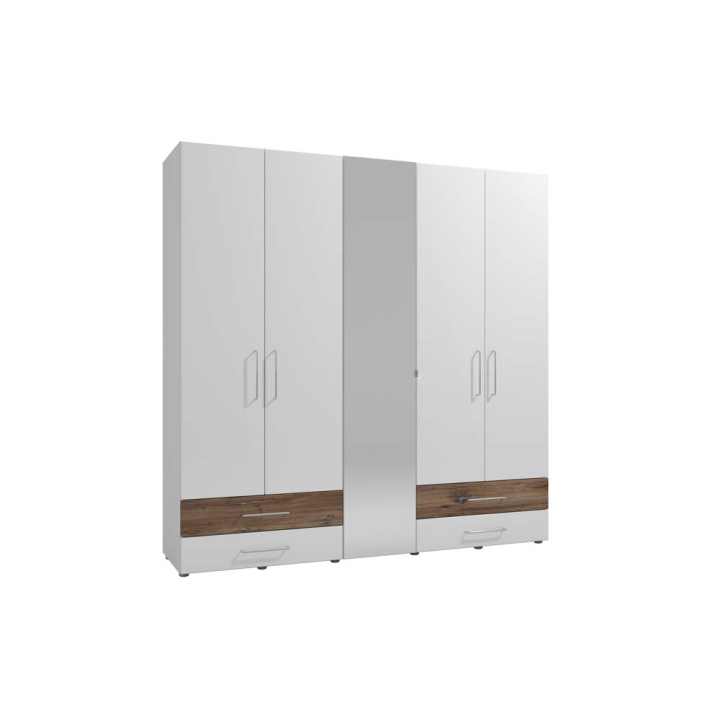 Петкрилен гардероб с размери Ш:224/Д:56.4/В:227 см. Със своите големи размери и практично вътрешно разпределение предоставя удобно място за съхранение на дрехи, одеяла, завивки и др. Притежава 3 отделения, като в 2-те крайни отделения са монтирани по 1 лост за дрехи и 1 горен рафт. В средното по-тясно отделение по височината на гардероба са поставени 4 рафта, образуващи 5 ниши. Вратите на модела са с луксозно бяло гланцово покритие и хромирани метални дръжки. Средната врата е с монтирано високо огледало, в което винаги може да прегледате външния си вид.