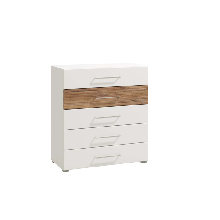 Комод с чекмеджета с размери Ш:90/Д:41.5/В:98 см. Притежава 5 обширни чекмеджета подредени едно под друго по височината на комода, както и компактен плот за поставянето на малки предмети. Чекмеджетата са удобно местенце за съхранението на дрехи, лични вещи, аксесоари и др. малки предмети в спалнята. Снабдени са с ролкови водачи и могат да се издърпват почти изцяло, дори и препълнени. Фронтовете са с бяло гланцово покритие снабдени със сребристи метални дръжки. Само едно от чекмеджетата е в дървесна текстура моделирано с декоративни улеи, стилно открояващо се и добавящо разнообразие във визията на комода.