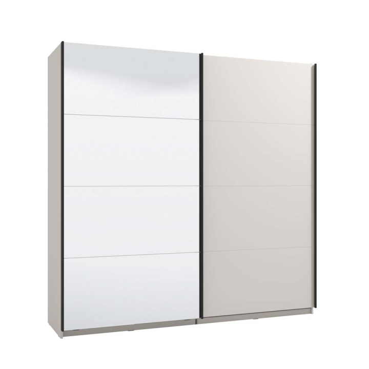 Вдъхновете визията на вашата спалня с топли нюанси и деликатна изисканост. Този функционален модел, притежава класическо вътрешно разпределение от две отделения с монтирани във всяко по един лост за закачалки и един рафт, предоставяйки различни варианти за съхранение. Освен на закачалки, удобно може да съхранявате на рафтове сгънати дрехи, одeяла или завивки. Вратите са плъзгащи с бежово гланцово покритие, метални дръжки и крачета.