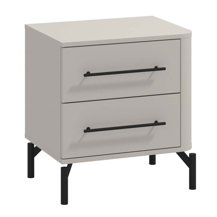 2 чекмеджета осигуряват практично място за съхранение на лични вещи, като запазват изчистения вид на пространството. Леките заоблени ръбове придават мекота на формата, а черните метални крачета и дръжки внасят модерен контраст и добавят нотка на индустриален шик.