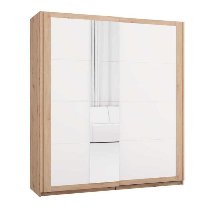 Двукрилен гардероб Картена с плъзгащи врати и огледало в декор дъб артисан и бяло, размери: 195/95/217,5 см
