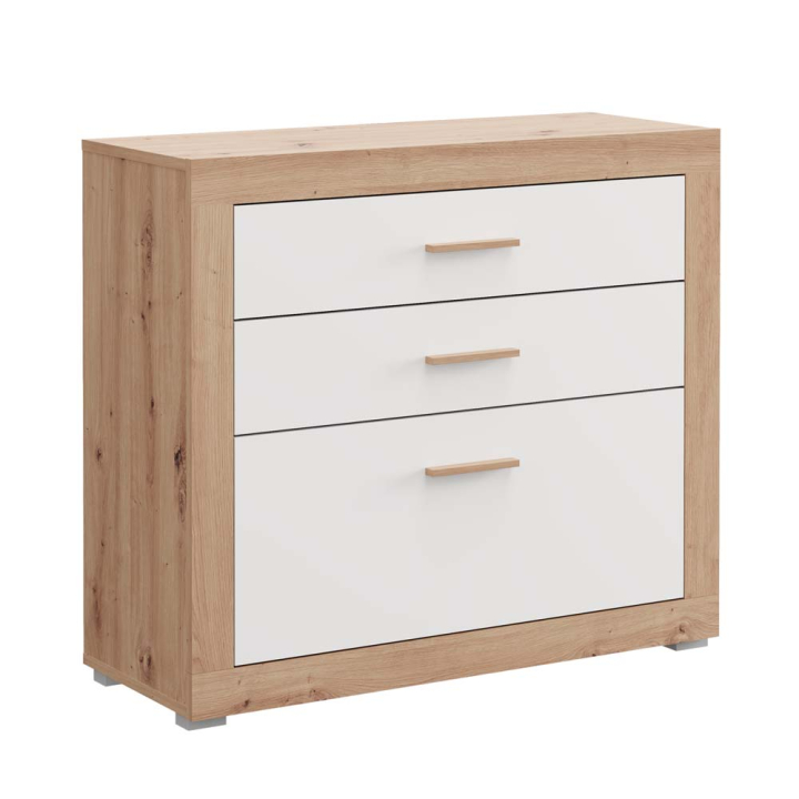 Комод Картена с 3 чекмеджета в декор дъб артисан и бяло, размери: 90/35/79 см