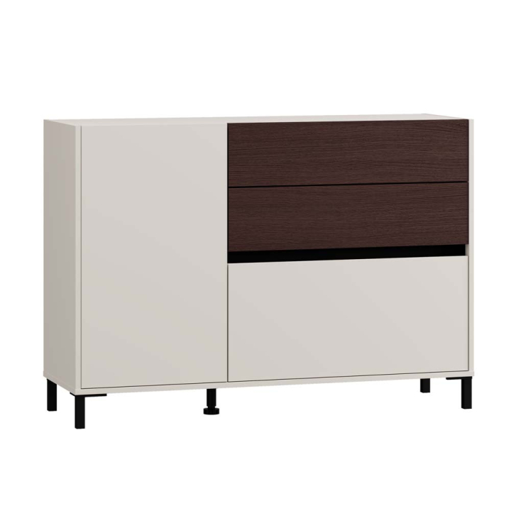 Комодът Колхида съчетава затворено отделение и чекмеджета в една балансирана композиция. Изчистената графична визия и контрастните цветове създават модерна, графична визия, която се вписва хармонично в цялостната концепция на серията.