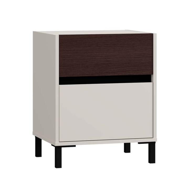 Нощното шкафче Колхида допълва интериора със своя изчистен и контрастен дизайн. Компактната му форма и двете чекмеджета осигуряват удобство и практичност, а комбинацията от кашмир и тъмен дървесен декор създава завършеност до леглото.