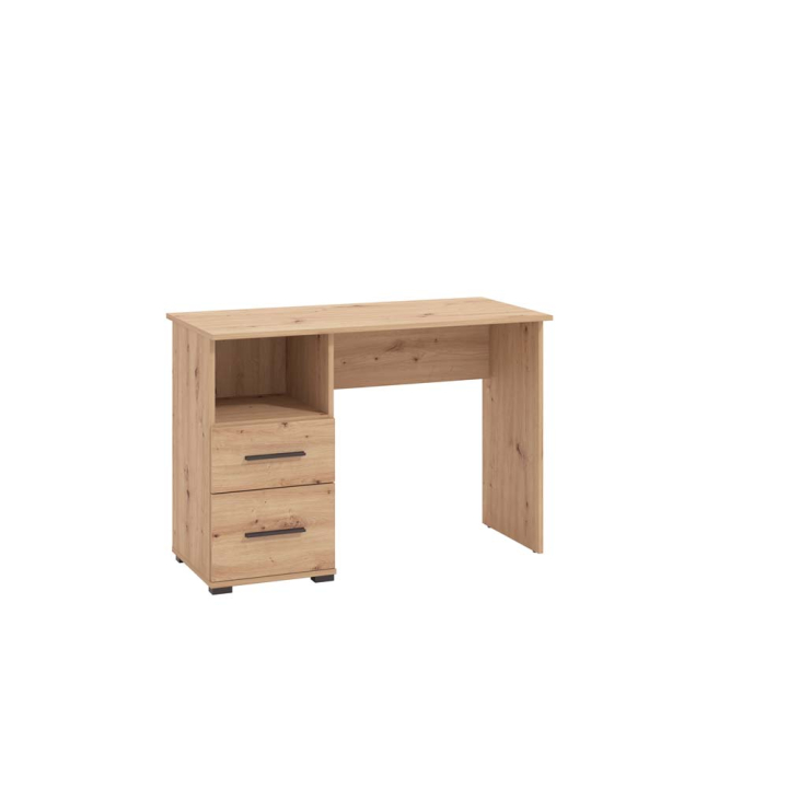 Компактно бюро с чекмеджета с размери Ш:110/Д:50/В:75.5 см. Бюрото разполага с работен плот, отворена ниша, както и две чекмеджета за функционалното организиране на работното пространство. Моделът е произведен от ПДЧ в светъл дървесен декор в класически дизайн с изчистени линии, удачно обзавеждане за дома или офиса. Въпреки своите компактни размери предоставя удобно място за съхранението канцеларски материали и принадлежности. Освен с светъл дъбов декор бюрото може да бъде изцяло в бяло с черни дръжки на чекмеджетата.