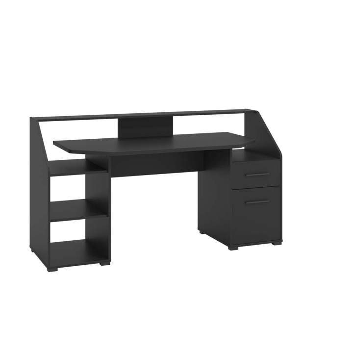 Бюро с практична надстройка рафт с размери Ш:170 /Д:65/В:92.5 см. Моделът е произведен от ПДЧ с меламиново покритие в черен цвят. Добро решение за обзавеждане на дома или офиса, поради своя атрактивен дизайн и много място за съхранение. Разполага с плот с големина 170/65 см, надстройка, едно чекмедже, отделение с врата на панти, както и два странични рафта.