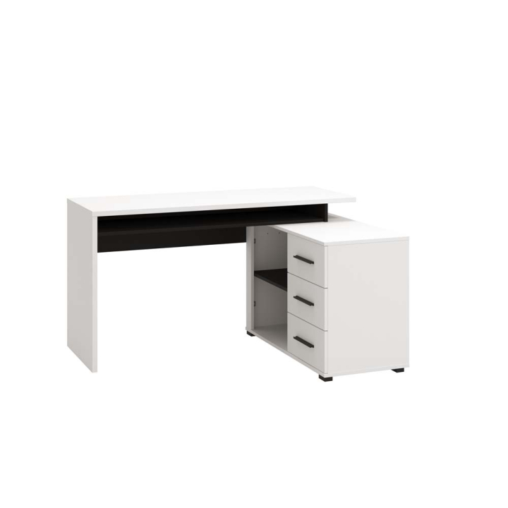 Модерно ъглово бюро с размери Ш:137.5/Д:101.5/В:75 см. Моделът се състои от практичен плот, под които е обособена обширна ниша. Към бюрото е прикрепен ъглов контейнер с 3 чекмеджета и 1 рафт, разделящ 2 отворени ниши за класьори А4. С бюрото ще превърнете работното място в подредено и удобно пространство за ефективна и плодотворна работа. Освен с практично разпределение с много място за съхранение, бюрото ще ви допадне и с модерната си визия в черно и бяло, което лесно може да комбинирате с мебели в други цветове и декори. Освен за обзавеждане на офиса, бюрото е удачно решение за обзавеждане и на дома.