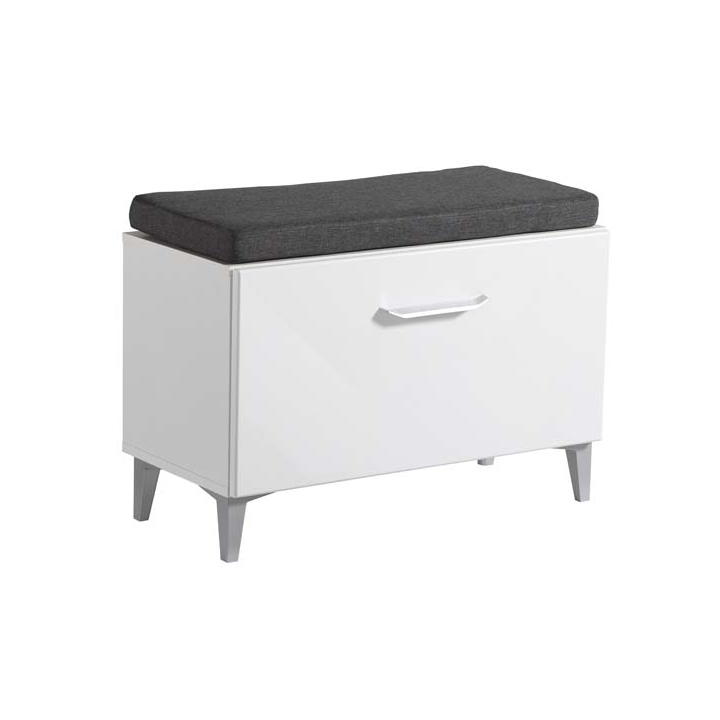 Пейка за антре с мека възглавница с размери на модела Ш:74.5/Д:35/В:47.5 см. Състои се от опростена конструкция произведена от ПДЧ с 1 клапваща врата, поставена на 4 крачета. Отделението за обувки е моделирано в 2 ниши с капацитет за съхранение около 4 чифта. Вратата на шкафа е с бяло гланцово покритие с монтирана сребриста дръжка.