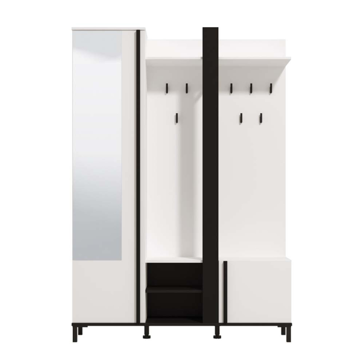 Портманто с размери Ш:135/Д:33/В:192 см. Предоставя хармонично, практично и добре организирано пространство за съхранение на връхни дрехи, лични вещи и аксесоари в антрето, като с модела цялостно ще преобразите атмосферата във входното помещение. Продуктът се състои от стенен панел, монтирани към него гардероб с високо огледало, горен рафт с лост за закачалки, осем единични закачалки, една отворена ниша, както и шкаф за обувки с врата на панти. Друго предимство на модела е наличието на удобно място за седене над шкафа за обувки, за комфортното поставяне на високите ботуши или новите обувки. Цветовата декорация е повече от удачна. Дизайнерите умело са комбинирали белия и черния цвят, при изработката на модела, като белия е доминиращ.