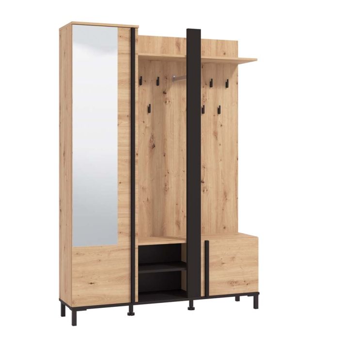 Портманто с размери Ш:135/Д:33/В:192 см. Предоставя хармонично, практично и добре организирано пространство за съхранение на връхни дрехи, лични вещи и аксесоари в антрето, като с модела цялостно ще преобразите атмосферата във входното помещение. Продуктът се състои от стенен панел, монтирани към него гардероб с високо огледало, горен рафт с лост за закачалки, осем единични закачалки, една отворена ниша, както и шкаф за обувки с врата на панти. Друго предимство на модела е наличието на удобно място за седене над шкафа за обувки, за комфортното поставяне на високите ботуши или новите обувки. Цветовата декорация е повече от удачна. Дизайнерите умело са комбинирали светлия дървесен декор и черния цвят, при изработката на модела, като дъбовата текстура е доминираща.