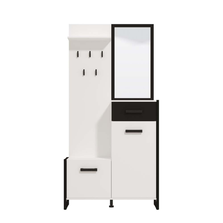 Портманто в бял и черен цвят с размери Ш:95/Д:33/В:191 см. Предоставя практично и добре организирано пространство за съхранение на връхни дрехи, лични вещи и аксесоари във вашето антре. Продуктът се състои от стенен панел и огледало с размери 45/1.5/82h, което може да бъде монтирано според желанието на клиента. Тази практична мебел се състои също от горен рафт, пано с пет единични закачалки 45/1.5/141h , едно чекмедже, две отделения с врати на панти, както и пейка с размери: 47.5/33/50h. Обособено е и отделение за обувки с с параметри: 47.5/33/109.5h. Пейката и шкафът за обувки са един общ модул и не могат да бъдат разделени. Дизайнерите умело са комбинирали белия и черния цвят при изработката на модела като белият цвят е доминиращ.