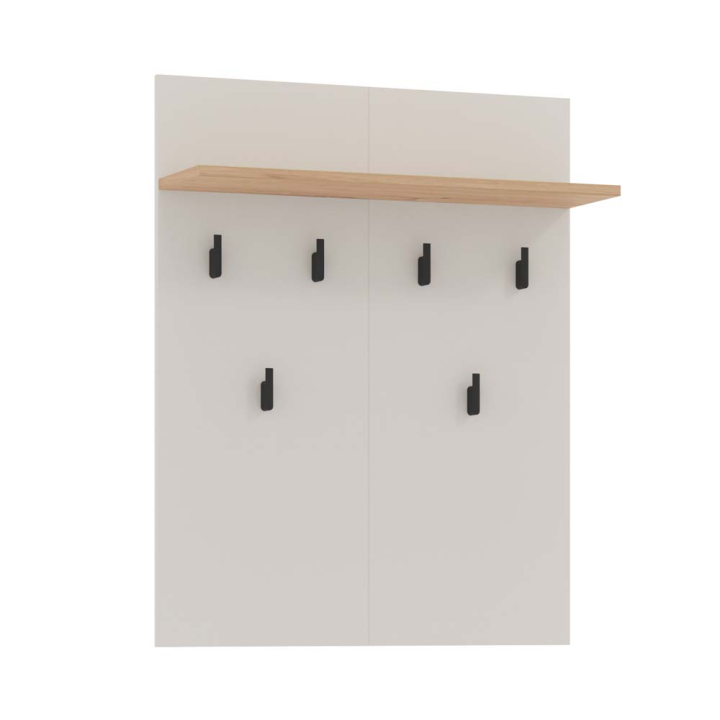 Пано XORA в бежов цвят, състоящо се от горен рафт в цвят дъб артисан и 6 закачалки в черен цвят, част от комплект Белфорт, с който може да съчетавате мебели от същия дизайн и цветова гама.