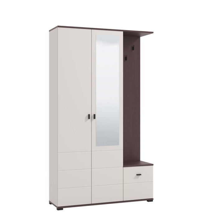 Съчетавайки елегантен модерен дизайн с практичност, това портманто предлага стилно решение за организиране на антрето. Комбинацията от топъл орех и мек кашмир създава уютна атмосфера, а огледалото на едната врата добавя функционалност и дълбочина в пространството.