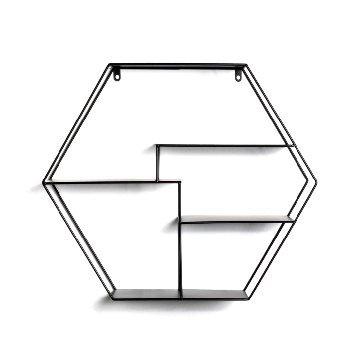 Стенна етажерка с размери Ш:61/Д:16/В:54 см. Моделът е произведен под формата на хексагон (шестоъгълник) изцяло от метал в типично индустриален стил. Разполага с пет етажерки, четири от които с ширина от 31 см, и един с ширина 26 см. В най-горната си част са обособени два отвора за прикрепване към стената. На рафтовете ще намерят практично своето място книги, артефакти, статуетки и други малки предмети, които ценим.