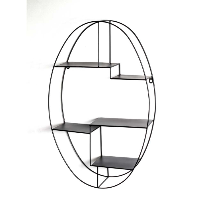 Стоманена етажерка за стенно окачване с размери Ш:44/Д:16/В:71 см. Моделът е изцяло боядисан в черно, като разполага с пет рафта, монтирани в елегантна овална конструкция. Два от рафтовете на етажерката са с ширина от 25 см, а три с ширина от 17 см, за надеждното съхранение и представяне на любимите ви предмети. Със своя елегантен и семпъл дизайн етажерката може да бъде поставена почти навсякъде в дома, като оставяме на вашето въображение, какво ще съхранявате на нея (артефакти, книги, вази с цвят и др.).