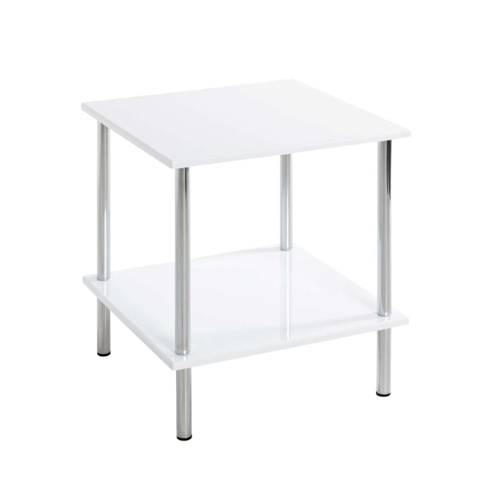 Правоъгълна помощна масичка с размери Ш:39/Д:39/В:45 см. Артикулът е произведен от висококачествен MDF и хромирани метални елементи с протектори щадящи пода. Масичката е с тегло от 2,9 кг, което позволява лесно да бъде преместена и поставена на най-удобното място в помещението, като по този начин освежителните напитки или кафето ще са само на една ръка разстояние. Между плота на масата и рафта има достатъчно място за поставянето на малки домашни предмети, вази, саксии и др. предмети.