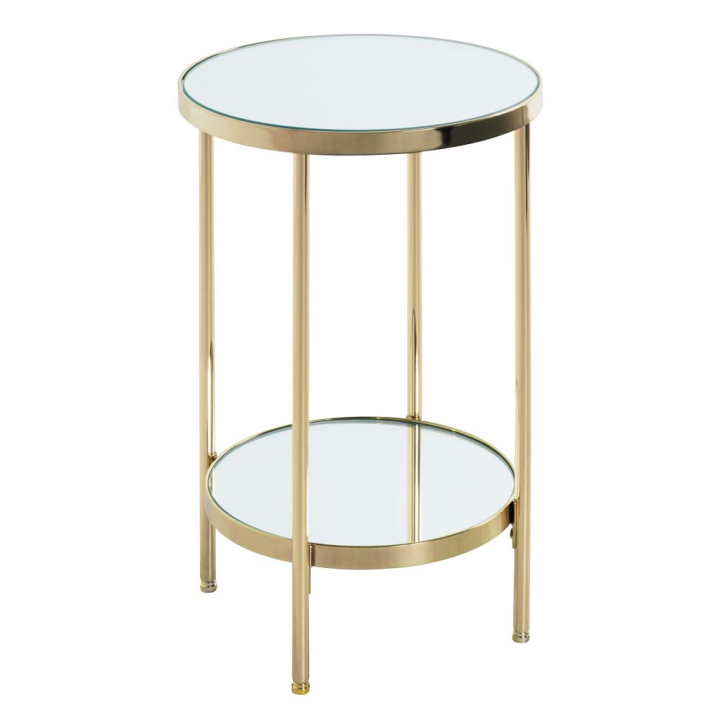 Стилен акцент с изискано излъчване. Тази елегантна кръгла помощна маса комбинира огледално стъкло и златисти метални елементи, за да внесе блясък и изтънченост във всяко помещение. Компактният ѝ размер я прави подходяща за поставяне до диван, кресло или като стилен декоративен акцент.