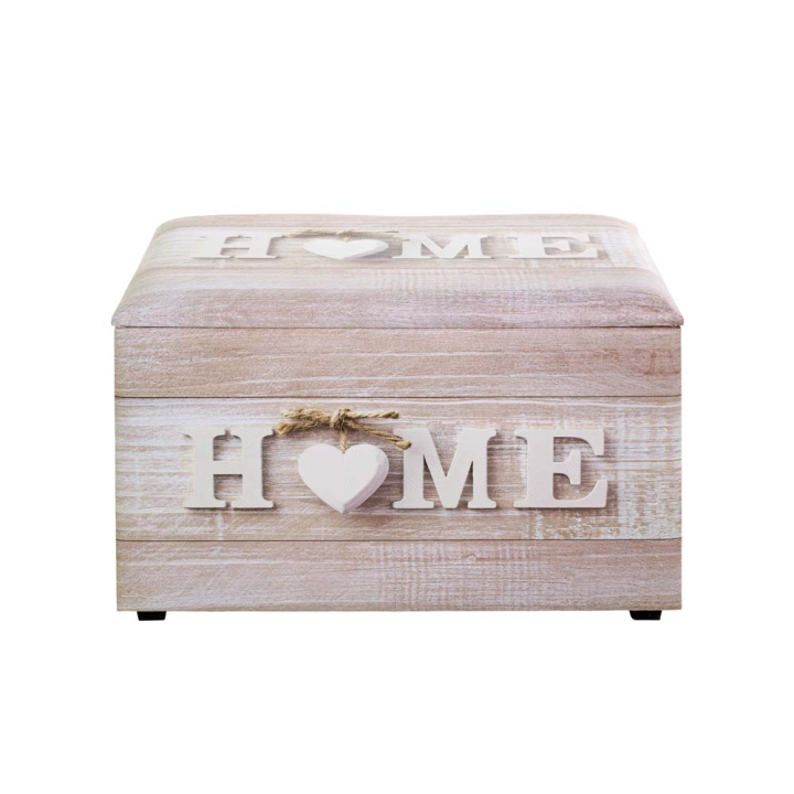 Пейка-ракла с размери Ш:65/Д:40/В:42 см. Моделът е цялостно тапициран с висококачествена еко кожа с красив дървесен декор и надпис “HOME”. Капакът на раклата е с пълнеж от пяна, за удобство по време на седне, като след повдигането му е достъпна ниша за съхранение. Конструкцията на раклата е произведена от MDF поставена на четири крачета.