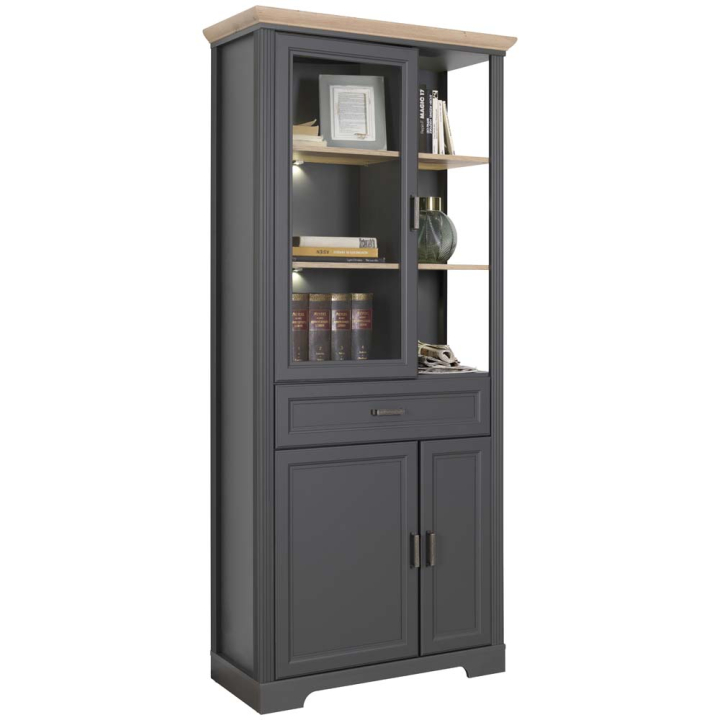 Висока витрина с LED осветление с размери Ш:93/Д:42/В:204 см. Състои се от горен плот в дървесен декор, врата със стъклена витрина, зад която са монтирани два рафта, странична отворена ниша, едно практично чекмедже, както и две врати на панти. Вграденото декоративното LED осветление зад витрината ще добави много уют към помещението. Моделът е с красив дизайн в античен стил декориран в светъл дъбов декор и сив цвят. Със своята визия без усилие създава атмосфера на желан разкош и уют в помещението. Не забравяйте да комбинирате шкафа с останалите мебели от серия Жасмин.