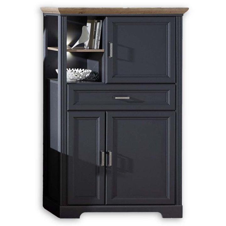 Ниска витрина с размери Ш:93/Д:42/В:150 см. Състои се от удобен горен плот, отворена ниша, едно чекмедже и три врати на панти с мех. за плавно затваряне. Компактен модел в античен стил в светъл дъбов декор и сив цвят. Със своята визия без усилие създава атмосфера на желан разкош и уют в помещението. Не забравяйте да комбинирате шкафа с останалите мебели от серия Жасмин.