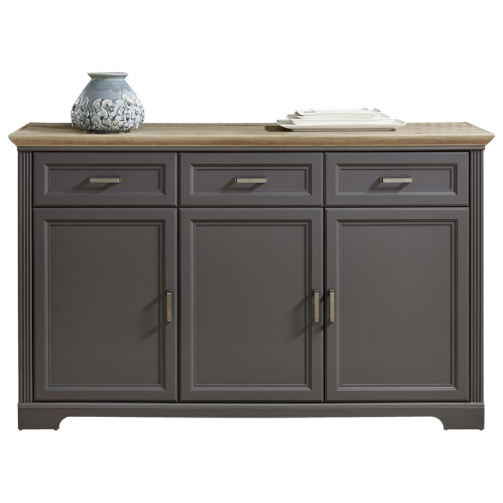 Контрабюфет с размери Ш:166/Д:48/В:102 см. Състои се от обширен горен плот, под който са обособени три еднотипни чекмеджета с метални дръжки в стил антик. Бюфетът разполага и с три отделения с врати на панти, зад които са монтирани три рафта. Моделът е с красив дизайн в античен стил декориран в светъл дъбов декор на плота и сив цвят на конструкция и вратите. Със своята визия без усилие създава атмосфера на желан разкош и уют в помещението. Не забравяйте да комбинирате шкафа с останалите мебели от серия Жасмин.