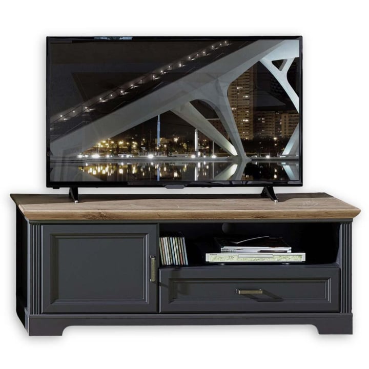 ТВ шкаф с размери Ш:143/Д:51/В:54 см. Плотът на модела е поставен на конструкция с цокъл и 4 L-образни странични модула с улеи. Под плота е обособено чекмедже за съхранението на малки предмети, отворена ниша и отделение с врата на панти. Дизайнът на шкафа е в античен стил в два декора бял бор и светъл дъбов декор. Със своята визия без усилие създава атмосфера на желан разкош и уют в помещението. Не забравяйте да комбинирате масата с останалите мебели от серия Жасмин.