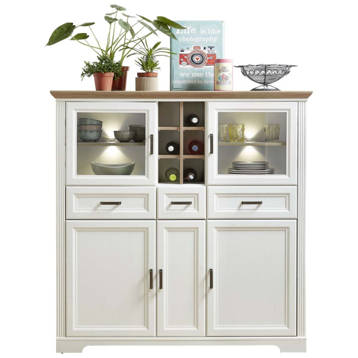 Бюфетен шкаф с декоративно LED осветление с размери Ш:143/Д:42/В:150 см. Състои се от удобен горен плот, две отделения с врати на панти със стъклени витрини, зад които са монтирани по един рафт, както и ниша с шест отделения за бутилки. Вграденото декоративното LED осветление зад стъклените витрини ще добави много уют към помещението. Бюфетът разполага и с три практични чекмеджета, както и три отделения с врати на панти, зад които са монтирани три рафта. Моделът е с красив дизайн в античен стил декориран в светъл дъбов декор и бял бор. Със своята визия без усилие създава атмосфера на желан разкош и уют в помещението. Не забравяйте да комбинирате шкафа с останалите мебели от серия Жасмин.