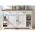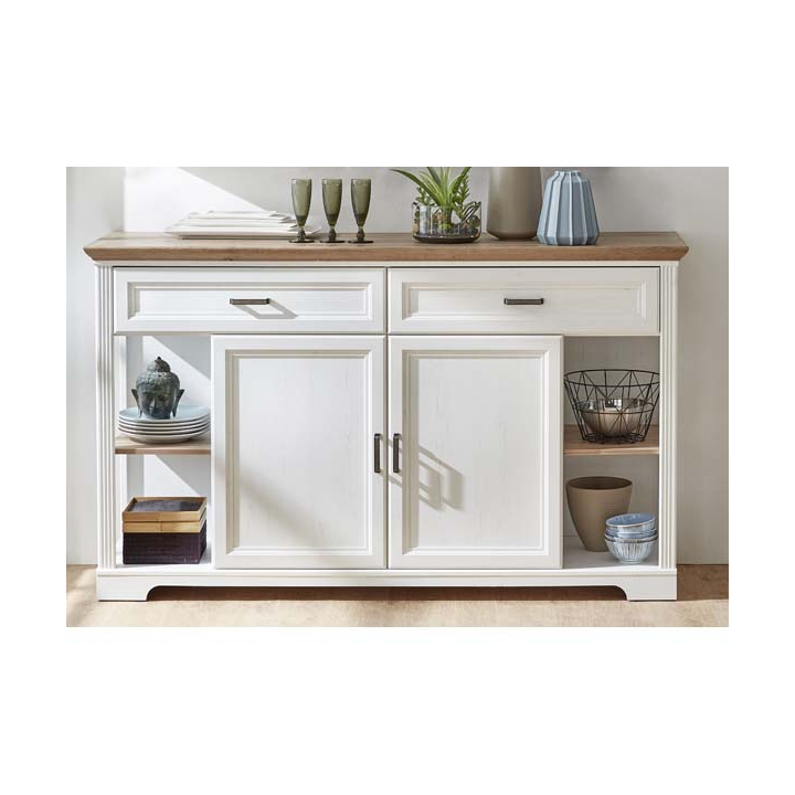 Контрабюфет с размери Ш:171/Д:48/В:102 см. Състои се от горен плот, под който са обособени две еднотипни чекмеджета с метални дръжки в стил антик. Бюфетът разполага и с два странични рафта, както и две отделения с врати на панти, зад които са монтирани два рафта. Моделът е с красив дизайн в античен стил декориран в светъл дъбов декор на плота и бял бор на конструкция и вратите. Със своята визия без усилие създава атмосфера на желан разкош и уют в помещението. Не забравяйте да комбинирате бюфета с останалите мебели от серия Жасмин.