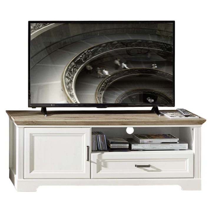 ТВ шкаф с размери Ш:143/Д:51/В:54 см. Плотът на модела е поставен на конструкция с цокъл и 4 L-образни странични опори с улеи. Под плота е обособено чекмедже за съхранението на малки предмети, отворена ниша и отделение с врата на панти. Дизайнът на шкафа е в античен стил в два декора бял бор и светъл дъбов декор. Със своята визия без усилие създава атмосфера на желан разкош и уют в помещението. Не забравяйте да комбинирате шкафа с останалите мебели от серия Жасмин.