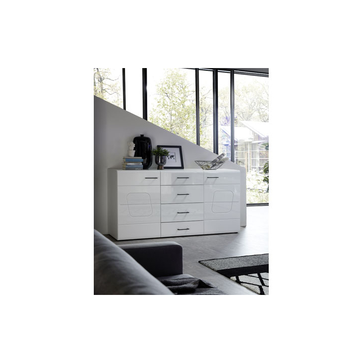 Контрабюфет от система Спирит Плюс се предлага в комбинация от фронтове от МДФ в бял мат. Корпус от ПДЧ.