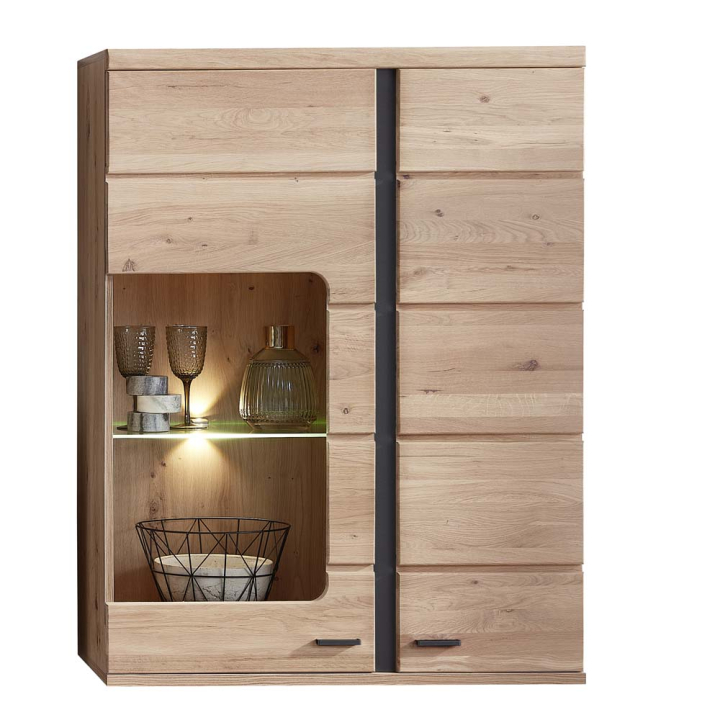 Стенен витринен шкаф с LED осветление с размери Ш:90/Д:38/В:120 см. Артикулът е с добре обмислен дизайн, притежаващ декоративни хоризонтални улей на вратите, стилна овална форма на рамката около витрината, декоративна черна матова апликация, LED осветление, както и дървесна декорация на вътрешните отделения. Състои се от две отделения с различна големина и различно вътрешно разпределение, визуално отделени чрез черна вертикална апликация. В дясното отделение, зад вратите на панти са монтирани 2 рафта, равномерно поставени по височината на шкафа, за съхранението на малки предмети. В лявото отделение, зад витрината врата с вътрешна дървесна текстура е поставен стъклен рафта с декоративно осветление, обособяващи красива площ за практичното и надеждно представяне на артефакти, статуетки, чаши, чини и други ценни предмети. Моделирана по този начин, витрината ще добави много блясък и стил към презентацията на любимите ви предмети. Най-отгоре в ляво, посредством ПДЧ рафт е обособено вътрешно пространство, практична ниша. Моделът е здрав и стабилен, с конструкция произведена от ПДЧ, и масив (ясен) на вратите.