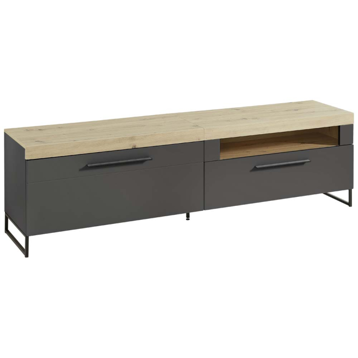 ТВ шкаф в рустикален стил с размери Ш:192/Д:44/В:55 см. Плотът на артикула е декориран в светъл дървесен декор (дъб Артисан), с големина 192/44 см, достатъчно голям за поставянето на повечето модели телевизори.Моделът разполага едно отделение с врата с хоризонтално отваряне, зад която е монтиран един рафт и обособена ниша за съхранението на домашни предмети в хола до телевизора. В ляво под плота е обособена отворена ниша, където може да поставите декодера и друга ТВ техника, както и едно дълбоко чекмедже с дръжка в черен мат.Корпусът на шкафа е цялостно декориран в графит (ултрамат), като единствено плота и вътрешността на шкафа е в светъл дървесен декор. Цялостната визия е стилна и изчистена, прекрасно допълнение към всяка дневна или хол, създаващ топъл рустикален уют.