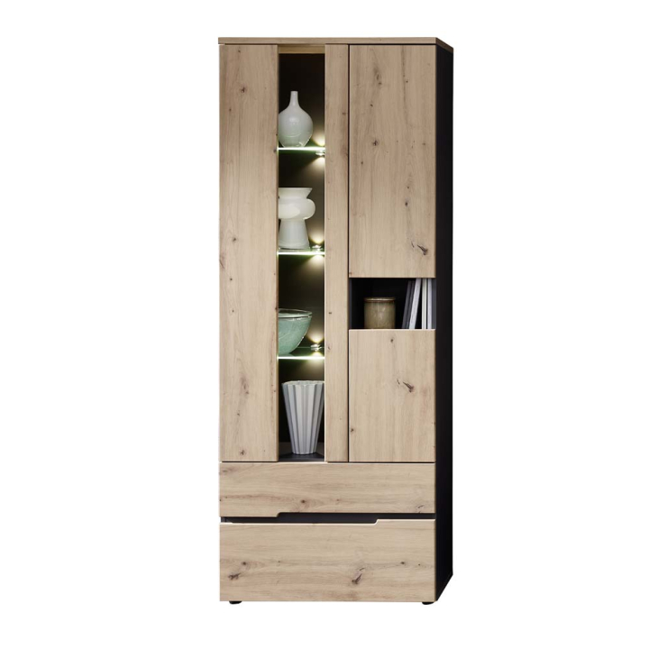 Висок витринен шкаф с чекмеджета и вътрешно декоративно LED осветление с размери на артикула Ш:75/Д:38/В:197 см. Шкафът разполага с две отделения достъпни посредством три врати на панти, едната от които със стъклена витрина, зад която са монтирани три стъклени рафта, красиво осветени със светодиоди. Дясното отделение е с монтирани две врати с красива текстура на дъбовата сърцевина, като на места дървесината е с чворове. В основата на шкафа са поставени две чекмеджета без дръжки. Корпусът на шкафа е произведен от ПДЧ в сив (антрацитен) цвят, а вратите на панти от MDF с дървесна текстура. Витрината може да комбинирате с други мебели от серията за да създадете модерна дневна в подчертан рустикален стил.
