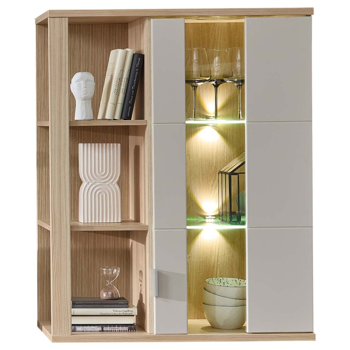 На вашето внимание представяме – стенна витрина с деликатен дизайн, изработена от  висококачествени материали, създадена да допълни модерния интериор с елегантност и практичност. Тази компактна мебел предлага иновативни решения за съхранение, съчетавайки стилен кашмирен супермат от МДФ и акценти от дъбов ламелен декор.