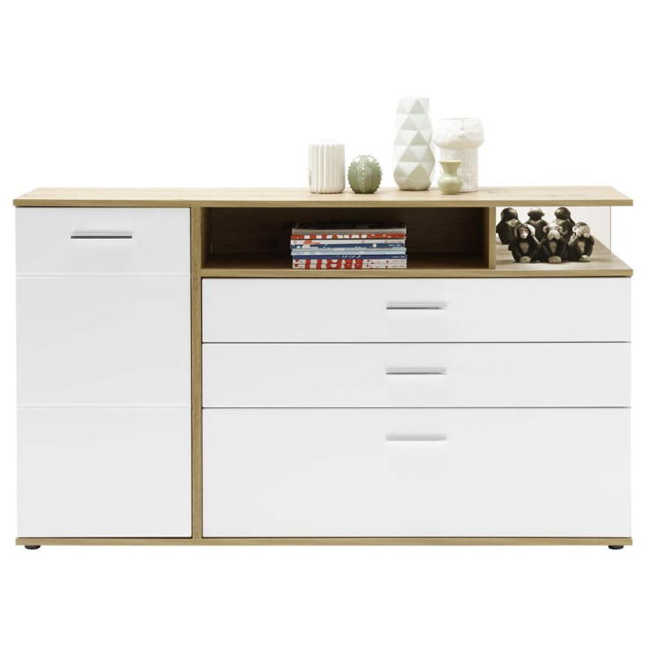 Стилен и модерен комод с 1 врата, 2 чекмеджета и 1 клапващ фронт, в Декори Бял гланц и Дъб Артисан
