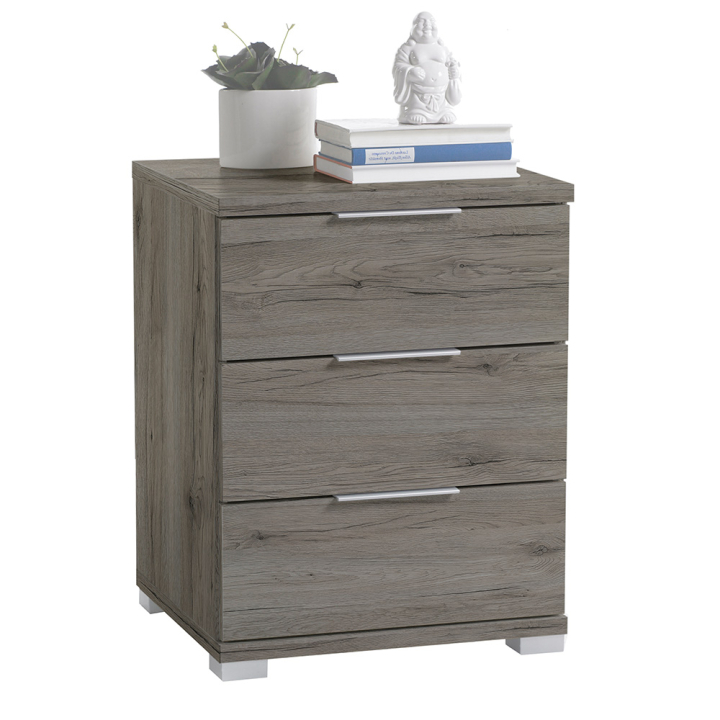 Нощно шкафче с размери Ш:46/Д:42/В:61 см. Със своята височина е подходящо за поставяне до боксспринг легло. Отличава се с широки и удобни дръжки на чекмеджетата произведени от PVC в сребрист цвят. Конструкцията е изработена от ПДЧ за 3 еднотипни чекмеджета. Идеалното място за съхранение на лични вещи в спалнята. Плотът е достатъчно голям за поставянето на нощна лампа, както и малки предмети от ежедневието. Проектирано е със семпъл дизайн в прави форми, който лесно може да комбинирате с други мебели. Визия, която ще остане актуална дълги години. Повърхността на модела е лесна за поддържане и почистване, устойчива на надраскване, износване и влага. Конструкцията е с бърз и лесен монтаж само следвайте инструкцията. Шкафчето може да бъде в бяло, светла или тъмна дървесна текстура, в зависимост от интериора и вашите предпочитания. Чудесно би стояло в помещение в скандинавски, средиземноморски, рустикален, класически или модерен стил.