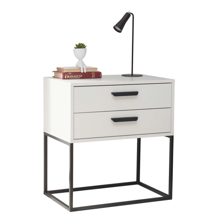 Нощно шкафче с чекмеджета с размери Ш:60/Д:38.5/В:65 см. Притежава семпъл, но стилен дизайн, който лесно може да комбинирате с други мебели. Проектирано е с правоъгълна конструкция с 2 чекмеджета, поставена на метална рамка за основа. Чекмеджетата са изключително удобни за съхранение на дреболийки в спалнята, като лесно може да бъдат изваждани посредством черни дръжки. Плотът е с компактни размери удобен за поставянето на нощната лампа или чаша с вода. Може да изберете да бъде в бяло, сиво или светъл дървесен декор.
