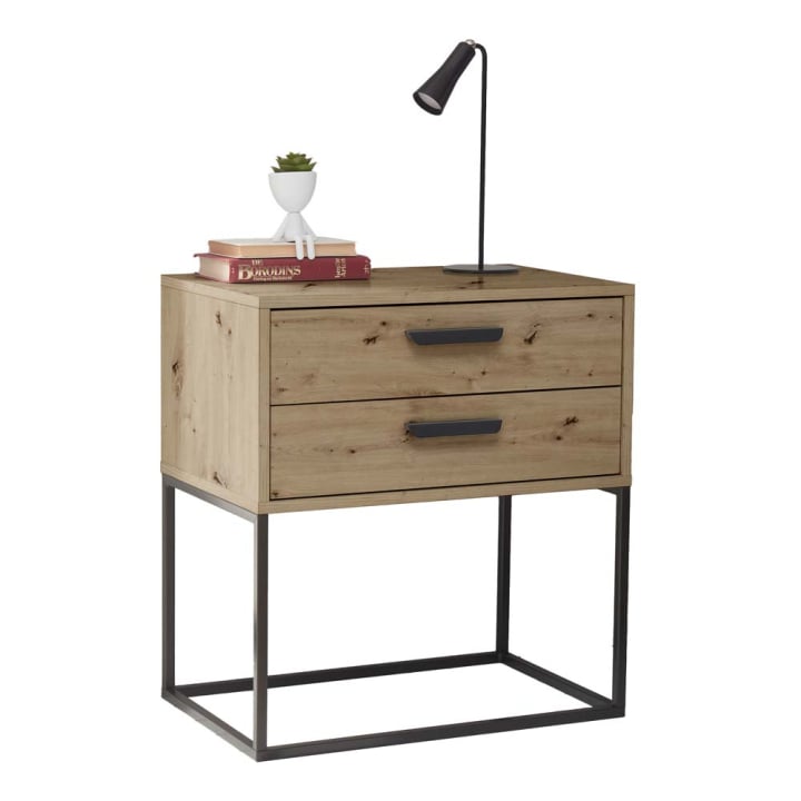 Нощно шкафче с чекмеджета с размери Ш:60/Д:38.5/В:65 см. Притежава семпъл, но стилен дизайн, който лесно може да комбинирате с други мебели. Проектирано е с правоъгълна конструкция с 2 чекмеджета, поставена на метална рамка за основа. Чекмеджетата са изключително удобни за съхранение на дреболийки в спалнята, като лесно може да бъдат изваждани посредством черни дръжки. Плотът е с компактни размери удобен за поставянето на нощната лампа или чаша с вода. Може да изберете да бъде в бяло, сиво или светъл дървесен декор.