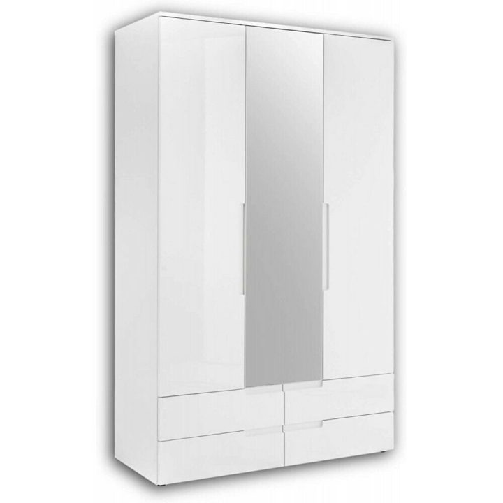 Трикрил гардероб с изчистен и елегантен дизайн. Корпусът на гардероба е изработен от ПДЧ - бял мат, а вратите и челата на чекмеджетата от МДФ - бял гланц.