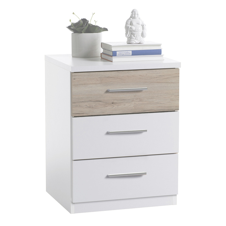 Притежава изчистена визия и 3 чекмеджета в бял цвят съчетан с цвят бук, отварящи се посредством фини, сребристи дръжки.