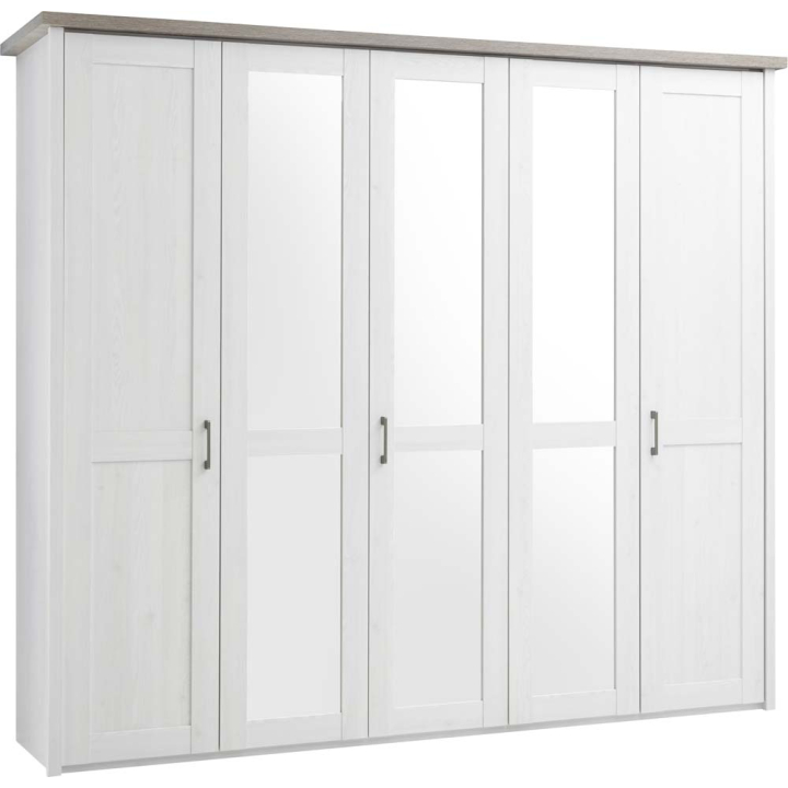 Петкрилен гардероб с размери Ш:241/Д:62/В:212 см. Със своите големи размери и вътрешно разпределение моделът е добро решение за обзавеждане на обширна детска стая или самостоятелна спалня. Притежава 3 самостоятелни отделения с врати на панти. В лявото и дясното отделение са монтирани по 1 горен рафт и 1 лост за закачалки. В средата равномерно по височината на гардероба са поставени 4 рафта, образуващи 5 ниши. Гардеробът е произведен от ПДЧ в 2 декора: бяло и светъл дървесен декор трюфел. Дизайнерите са раздвижили дизайна, като са моделирали вратите с правоъгълни рамки.