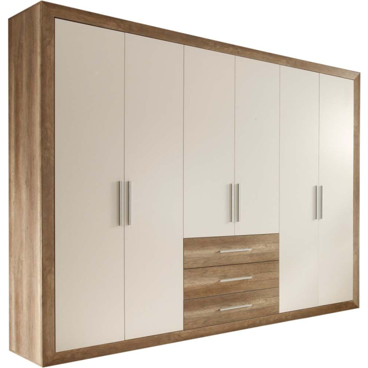 Шесткрилен гардероб с чекмеджета с размери Ш:289/Д:59/В:225 см. Произведен е със стилен съвременен дизайн и стабилна конструкция. Притежава 3 самостоятелни отделения с 6 врати на панти в бял цвят и дръжки в цвят алуминий. Във лявото и дясното отделение са монтирани по 1 лост за дрехи и по 1 горен рафт, а в средното 2 рафта и 1 лост за дрехи, като под тях са поставени 3 практични чекмеджета. Под лостовете за закачалки има много място за поставяне на куфари, кутии за съхранение на дрехи или кутии за обувки.