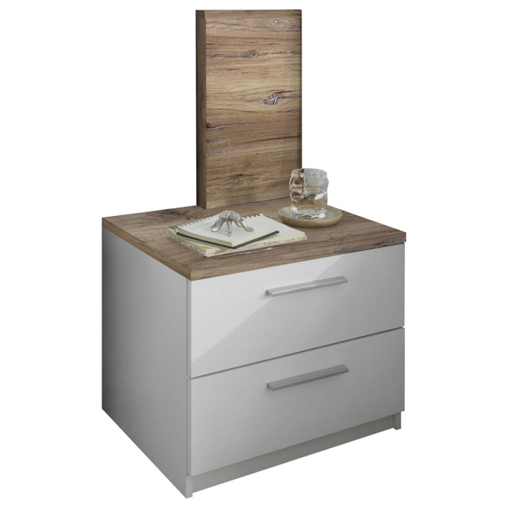 Нощно шкафче с декоративен стенен панел с размери Ш:55/Д:40/В:89 см. Моделът е съобразен с височината на спалнята от комплекта, с приблизителна височина на спане около 46.2 см. Притежава красив плот и стенен панел в дървесен декор, две чекмеджета със сребристи дръжки, както и конструкция с цокъл. Необходимо и функционално обзавеждане за съхранението на лични вещи и аксесоари в спалното помещение.